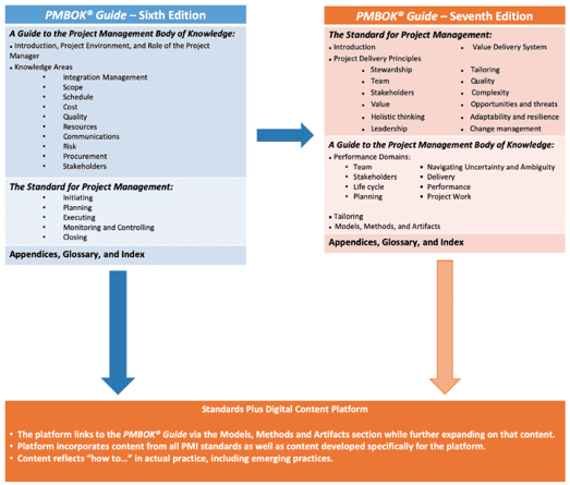 Uusi PMBOK Guide seitsemäs painos, kuten aiempikin, sisältää kaksi osaa: Standardi ja sitä selittävä Body of Knowledge – osa. Lisäksi kokonaan uutena kokonaisuutena tuodaan verkossa tarjottava Standards Plus digitaalinen sisältö.